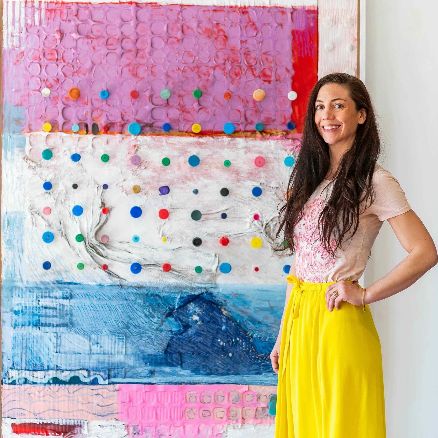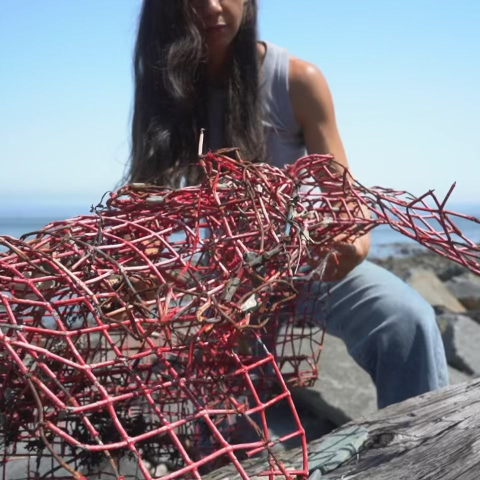 Inspired by her sense of place in the world, Jackie creates work that infuses a space with peace, expansiveness, and interest. Her colors and compositions are soothing with color pops, patterns, and shapes that are influenced by the elements, the sea, sky, and surrounding nature. The beach trash and marine debris that she works with includes fishing rope, balloons, bottle caps, buoys, plastic packaging, lobster traps, and much more.