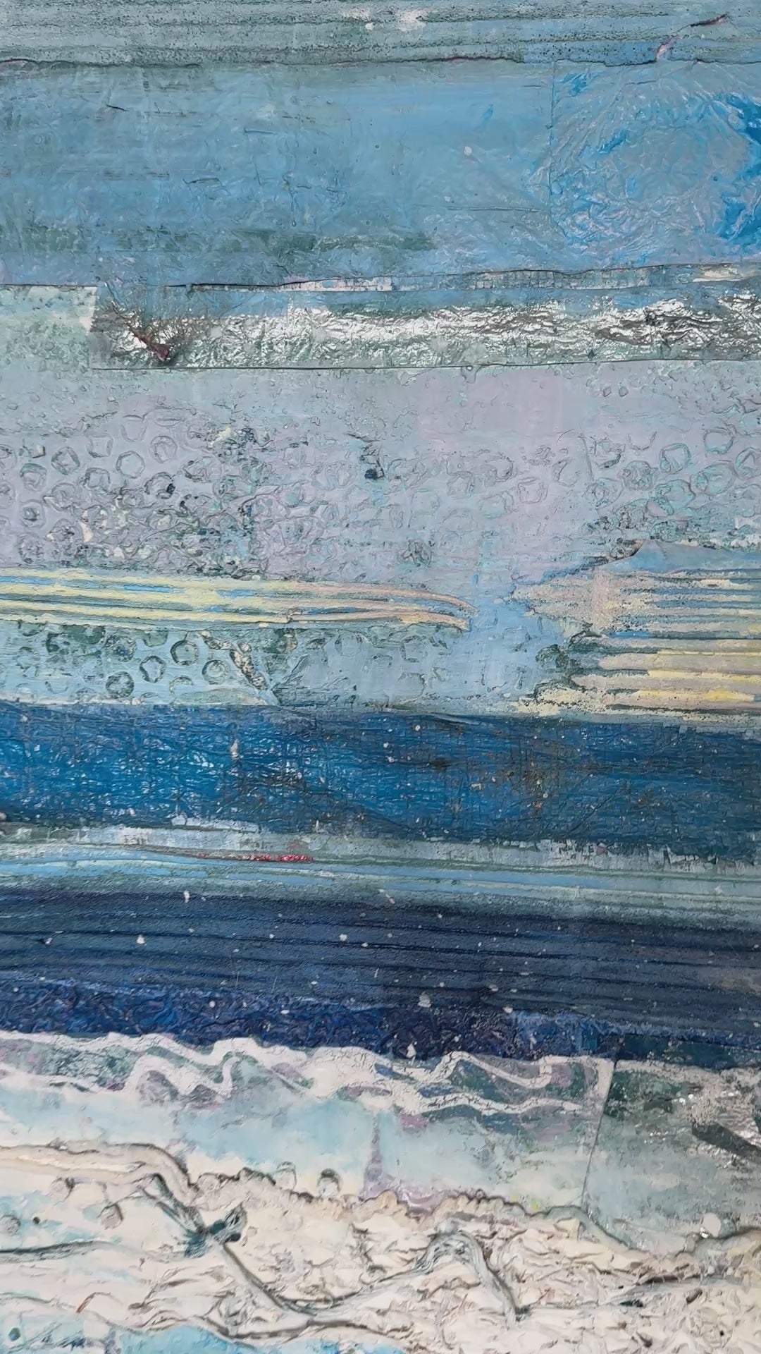 South Beach is inspired by the wild beauty of Martha’s Vinyard beaches. It is created from the material I cleaned off of Peddocks Island in the September 2025. The clean, organized by Laura Ludwig, Director of Marine Debris, at the Center for Coastal Studies removed more than 20,000 lbs of material over four days. Material used includes styrofoam, Mylar balloon, styrofoam packaging, bubble wrap, fishing rope, bungee cord, linoleum flooring, fiberglass, and much more. My pet name for this painting is 'Happy Birthday' because I used four happy birthday mylar balloons. See if you can find the words scattered throughout the piece.